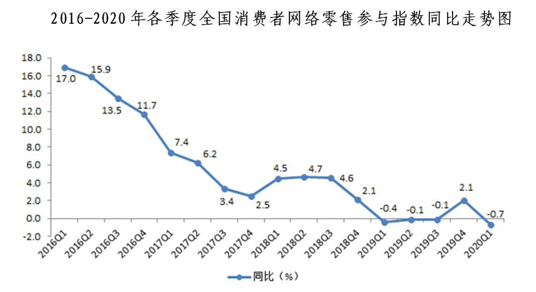 近日,中國國際電子商務(wù)中心與易觀聯(lián)合發(fā)布了2020年一季度“全國網(wǎng)絡(luò)零售發(fā)展指數(shù)”及其分指數(shù)。2020年一季度,全國網(wǎng)絡(luò)零售發(fā)展指數(shù)受疫情影響,環(huán)比下降2.7%,增速較上季度下降6.1個百分點(diǎn);但同比仍增長5.1%,增速較上季度提升2.5個百分點(diǎn)。