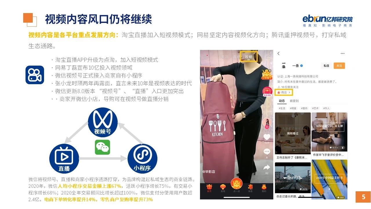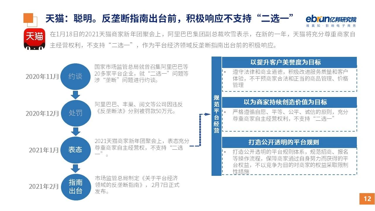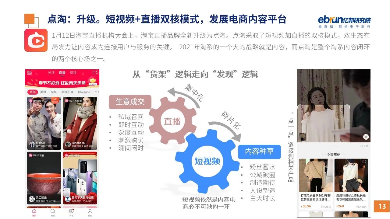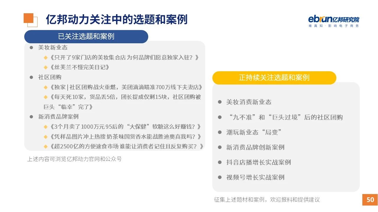 縱觀2021年1月,各平臺豐富自有生態(tài)布局,如淘寶直播(點淘)加入短視頻模式、騰訊重押視頻號、快手加碼電商和小程序、抖音推出支付等;視頻內(nèi)容成為各平臺未來重點發(fā)力方向;“九不得”新規(guī)發(fā)布后社區(qū)團購仍熱情不減;國家和市場對互聯(lián)網(wǎng)巨頭和電商相關(guān)消費加大監(jiān)管力度……你信和不信,你知道和不知道的,都在這份億邦動力研究院正式發(fā)布的